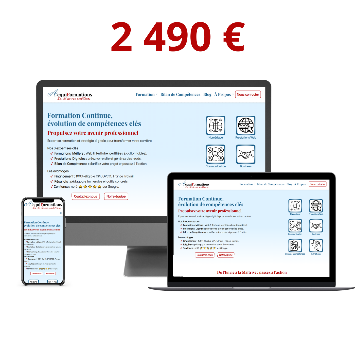 Ce pack inclut un webdesign moderne et épuré, 100 % adapté aux smartphones et tablettes, garantissant un temps de chargement rapide.